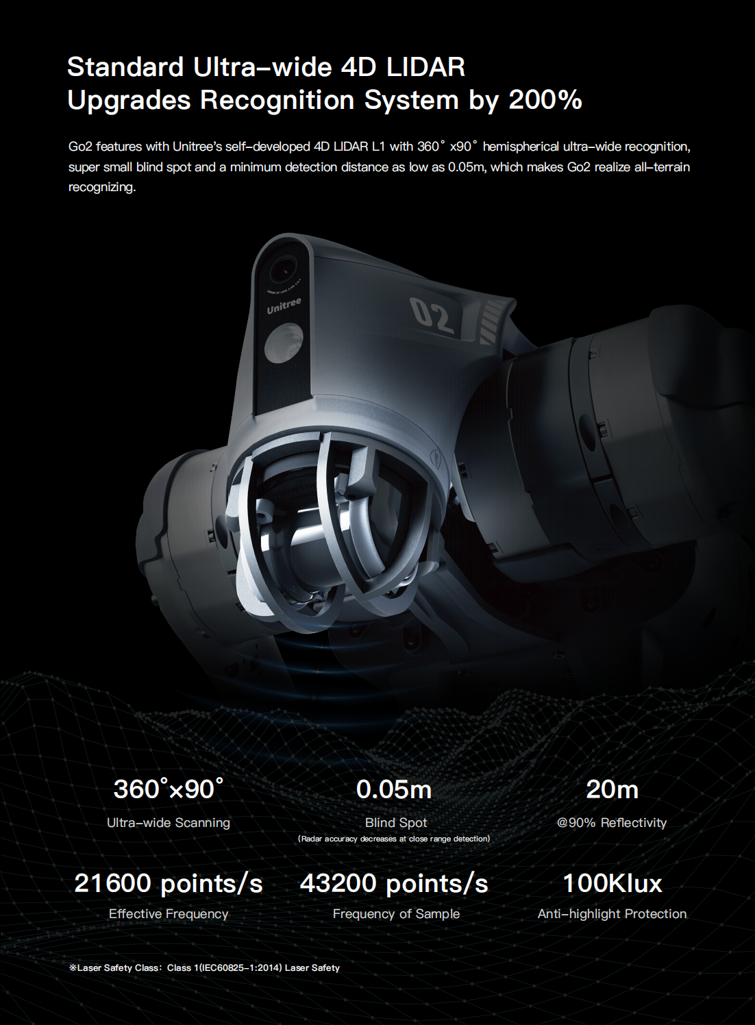 Unitree’s 4D LiDAR (L1) scans 360°x90°, detecting obstacles as close as 0.05m. Pair with the remote for effortless auto-avoidance on any terrain. The 1280x720 HD wide-angle front camera captures expansive views — see broadly, control effortlessly.