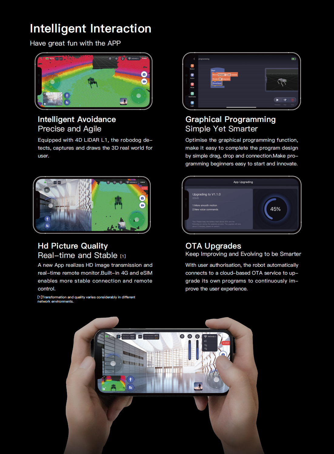 Control every move of your Go2 Pro through Unitree’s intuitive mobile app. Adjust gaits, trigger dynamic actions (backflips/dances), stream live HD camera views, or activate Pet Mode remotely—all from your smartphone. Seamlessly integrate voice commands, AI chats, and custom routines for effortless smart companionship.