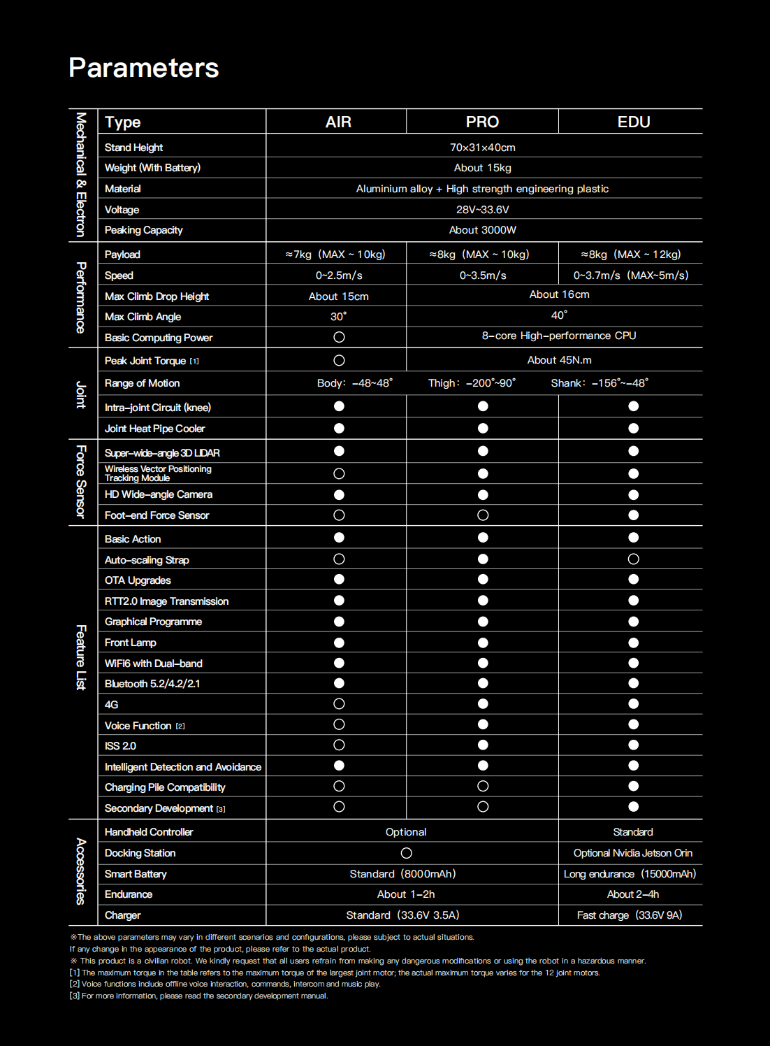 Go2 Pro’s joints deliver 45N.m peak torque and support payloads up to 15 lbs (6.8 kg). Control via remote to execute dynamic actions: handshakes, standing poses, jump-running, rolls, handstands, festive greetings, backflips, and more.
